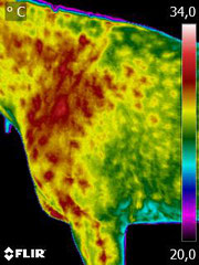 Hier sehen wir thermografisch ein gutes Bild einer leichten Schulterblockade bei einem Kundenpferd.